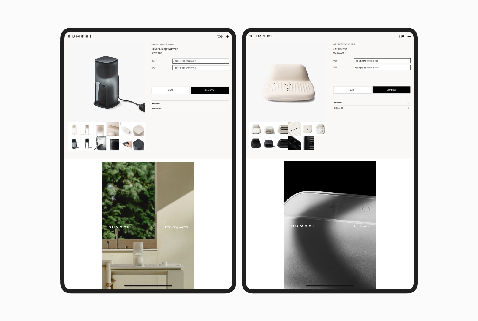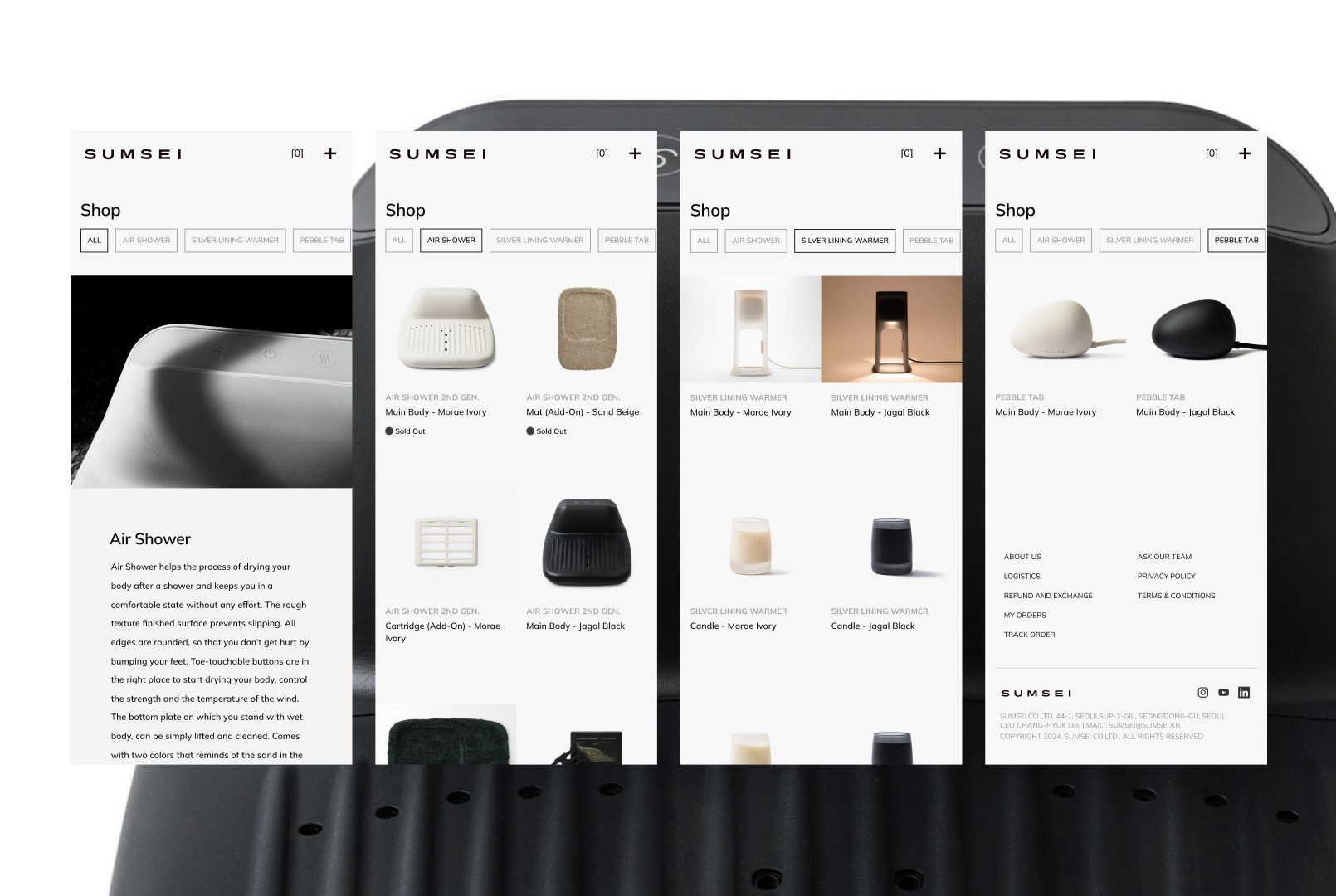 섬세이 브랜드 공식 웹사이트를 디자인했습니다. 웹사이트는 브랜드 철학과 스토리텔링을 디지털 환경에 재현하고자 제작되었습니다. 자연에서 불어오는 바람, 나부끼는 나무, 은은한 향기, 지저귀는 자연의 소리와 같이 자연에서의 감각 경험을 담았습니다. 풀사이즈 이미지 블록으로 생생하고 몰입감 있는 경험을, 은은한 모션을 더해 이완의 정서를 기반으로 한 브랜드 스토리텔링을 섬세하게 전달했습니다.